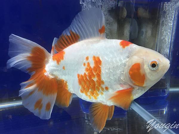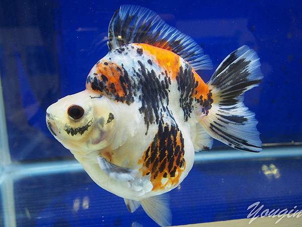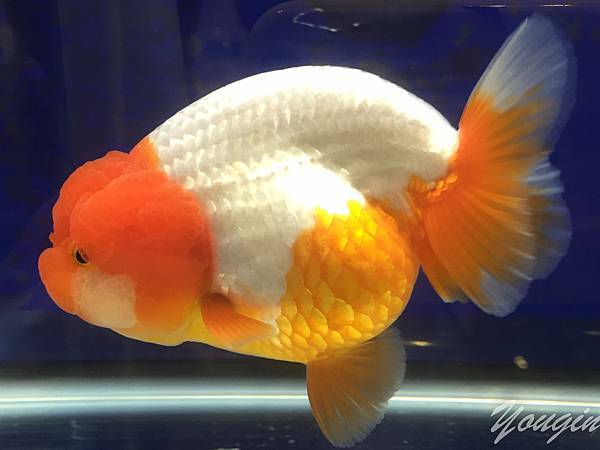 三色短尾琉金,像錦鯉一般的三色表現,日本好像很愛
